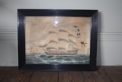 An early 19th century naive watercolour of a fully rigged ship from the English Fleet. It is likely that this painting was painted by a member of the crew and has a naive charm, hence the amateur perspectives. The paper has a degree of browning. The picture is mounted in a contemporary ebonised frame.